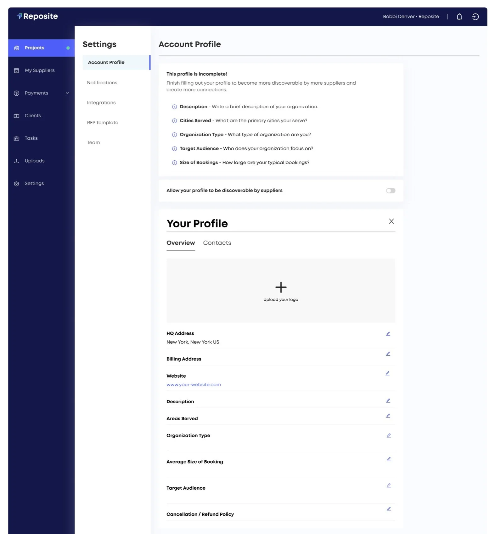 Creating a complete and detailed planner profile on Reposite is essential to making meaningful connections with suppliers. A well-crafted profile helps suppliers understand your needs and planning style, which allows them to tailor their responses and proposals to best suit your preferences. Here’s a step-by-step guide on setting up your profile and why it matters.