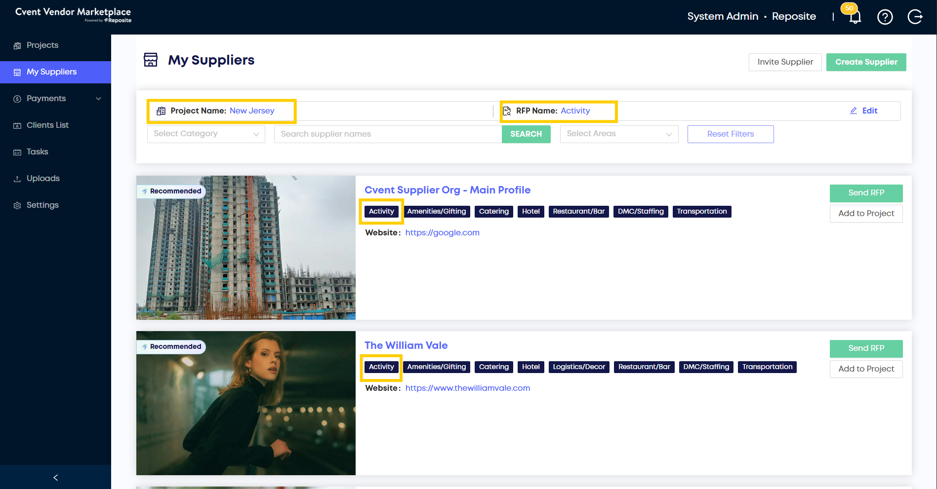 Apply filters to find the supplier you wish to send an RFP to and click the "Send RFP" button next to their name. This action will trigger a popup window, where you can select the project and the relevant RFP to send. This ensures that the RFP is correctly associated with the right project.Click "Send RFP"