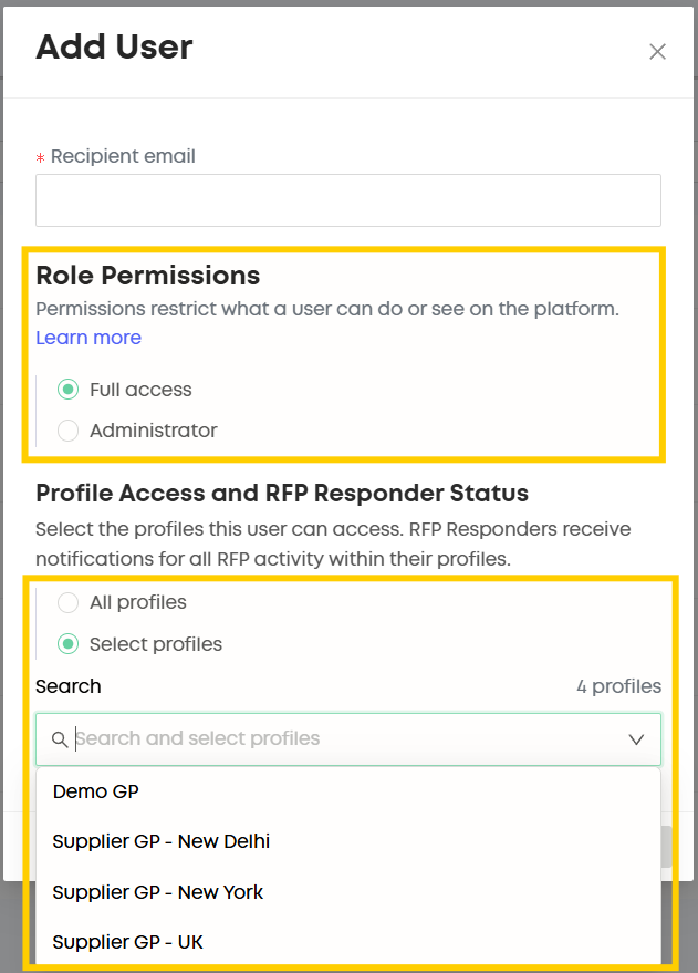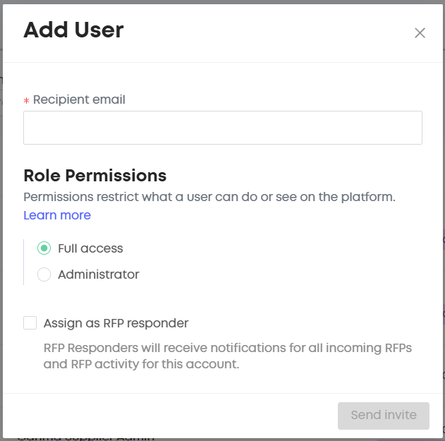 Note : Admins can invite Admin and Full access users and can update the RFP Responder as well, however Full access users can only invite full access users only.