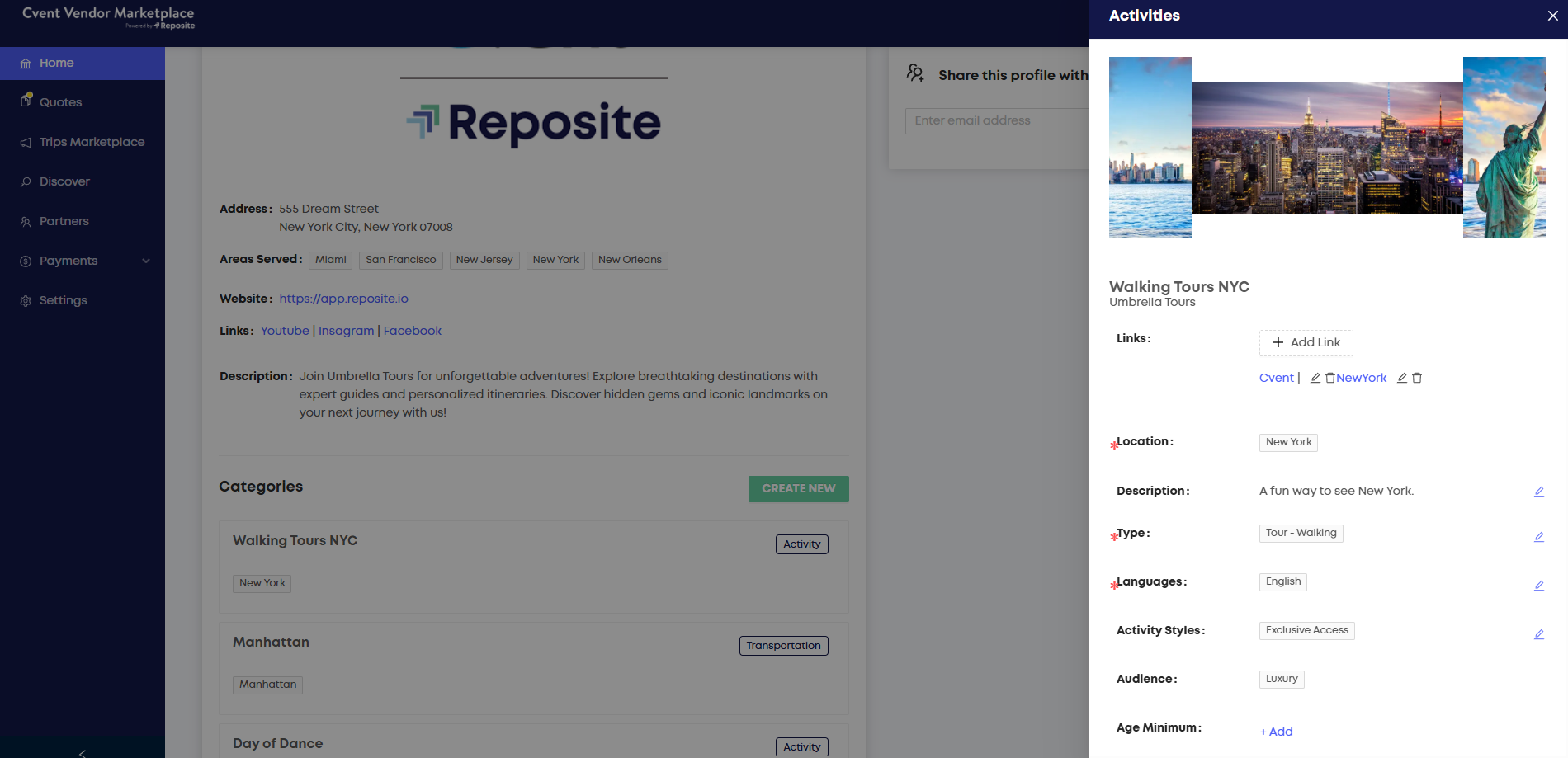 At the bottom of your profile is a section called “Categories”. Categories in Reposite are used to help Planners see the different types of services and offerings your company has. Your profile should have one category for each product that you offer – this will ensure your partners find you in their search results as they are crafting proposals. Here’s a Guide for all Categories that are available.